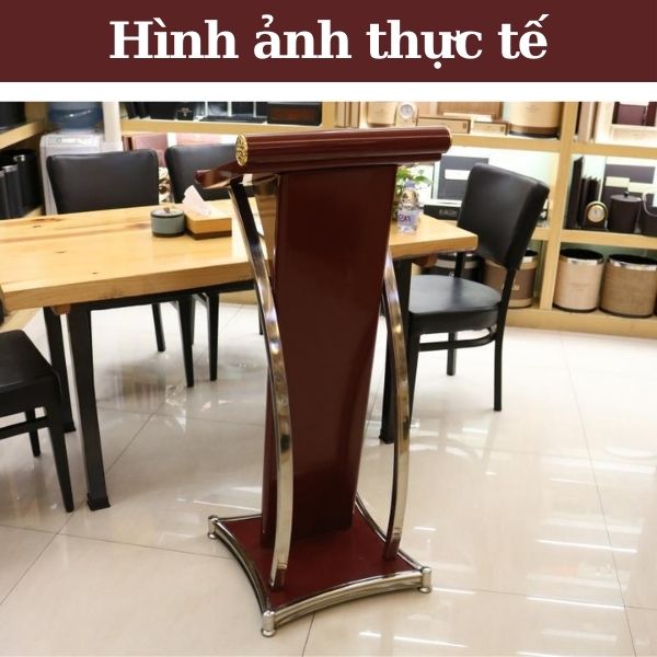 Viền ngoài bục thuyết giảng được làm bằng inox trắng hoặc inox vàng không han gỉ, chống oxy hóa, bóng sáng. Chất liệu inox cũng dễ lau chùi, vệ sinh, giúp sử dụng lâu dài mà không mất đi tính thẩm mỹ.