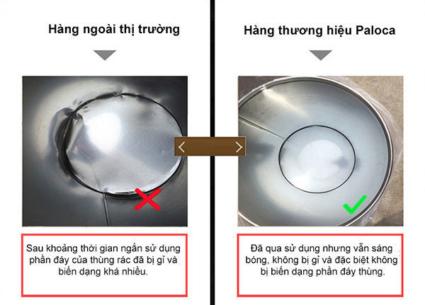 Phần chân đế cao su của thùng rác inox hàng trôi nổi thường bị bong ra sau một thời gian ngắn đưa vào sử dụng, còn phần cao su của thùng rác inox Paloca thường rất chắc chắn và gần như không thể bong được.